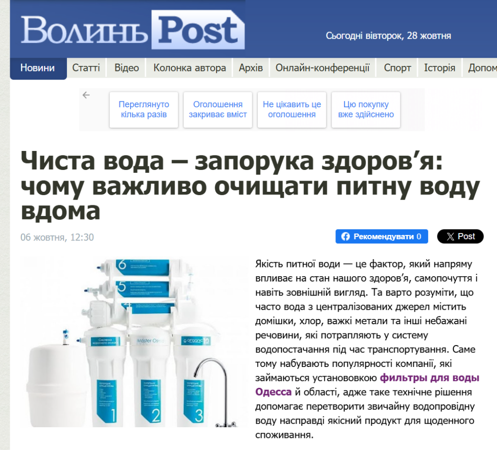 Ось приклад комерційної джинси на сайті «ВолиньPost», який розмістив текст про важливість чистої води, однак вшив у матеріал лінки з сайтом для придбання фільтрів для очищення води.