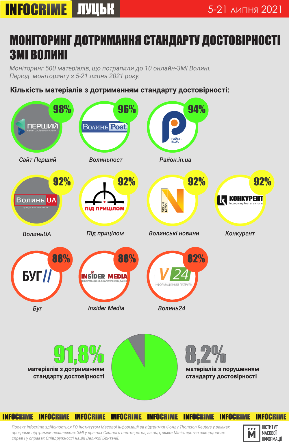 Із 500 промоніторених матеріалів на 10 популярних волинських сайтах – 8,2% публікацій з порушенням стандарту достовірності. Щоправда, 91,8 % матеріалів написані з дотриманням стандарту достовірності.