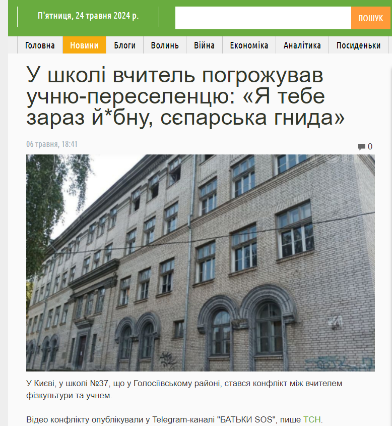 Втім, тема не обійшлась без мови ворожнечі. Наприклад, сайт «Волинь24» відзначився недоречним цитуванням висловлювань з мовою ворожнечі та нецензурною лексикою про учня-переселенця. Редакція могла обійтися без тричі повтореної цитати про «сєпарську гниду» у новині та нецензурної лексики у заголовку. Крім того, новина написана неякісно, бо інформація скопійована з Telegram-каналу «БАТЬКИ SOS» та невідомо про кого саме йдеться без жодних додаткових коментарів. Немає і позиції школи, чи така ситуація справді була.