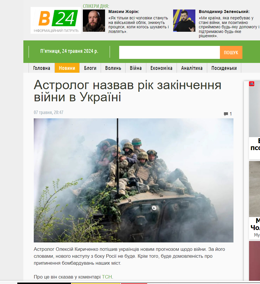 Також у новині «Астролог спрогнозував, звідки росія може розпочати новий наступ» варто було б отримати коментар у військового експерта, а не астролога. Заголовок «Астролог попередив про можливі сенсаційні події в Україні» є клікбейтним, бо читач відкриє повідомлення, щоб дізнатися, у чому ця сенсаційність. Інформація про «новий наступ, звідки не очікували» теж може додати стресу, хоча фактів та фахового коментаря нема. До слова, всі новини були з посиланням на сайт ТСН.ua. Зауважимо, що і після повномасштабного вторгнення Росії в Україну «Волинь24» теж публікував передбачення астролога щодо закінчення війни, а також про ймовірний початок боїв за Крим. У 2022 році Волинь24 публікували прогноз астролога Дмитра Уранусв, який казав, що війна буде тривати щонайменше до кінця 2023 року і вже ніколи не повториться знову. Як бачимо, такий прогноз не справдився.