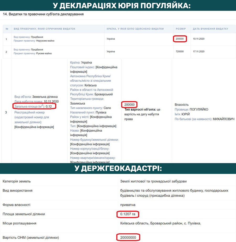 До слова, в системі Держгеокадастру оціночна вартість землі Юрія Погуляйка під Києвом вказана у розмірі 20 мільйонів гривень, тоді як в декларації – 200 тисяч гривень. І саме такий видаток посадовець задекларував.