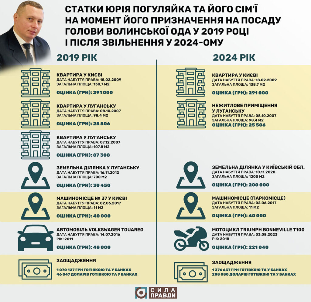 2 грудня 2019 року колишнього першого заступника Луганської військово-цивільної адміністрації Юрія Погуляйка призначили на посаду голови Волинської обласної державної адміністрації. Заступав на посаду чоловік з 5-ма обʼєктами нерухомості: земельною ділянкою, квартирою та нежитловим приміщенням у Луганську, квартирою з паркомісцем у Києві. Усе майно, за винятком землі, належало його дружині Вікторії Погуляйко, яка працює приватним нотаріусом у Києві.