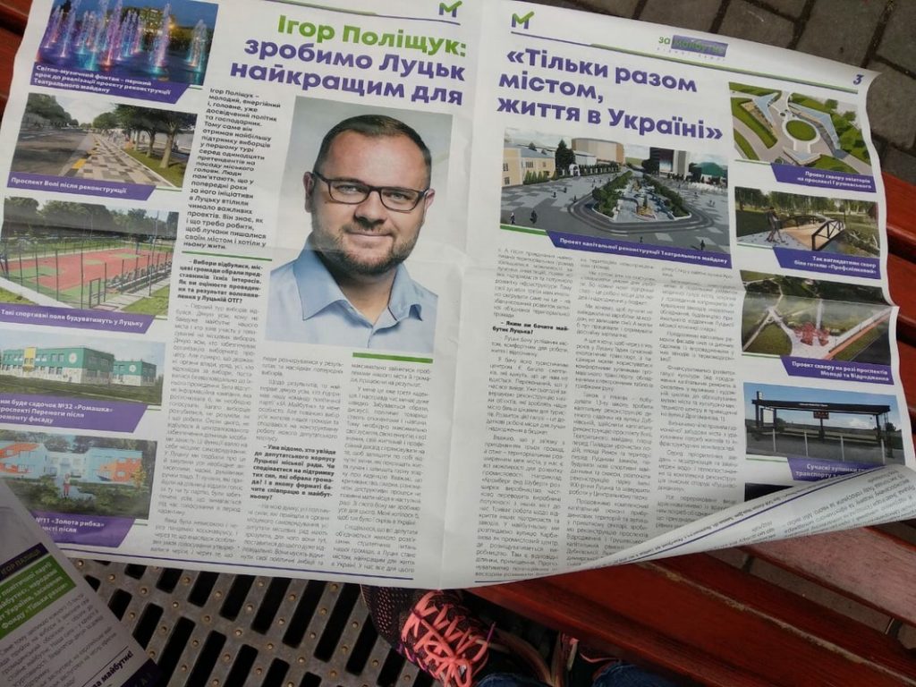 Газета з Ігорем Поліщуком «За майбутнє» містить інформацію про сильні сторони кандидата, інтерв’ю із ним, у котрому йдеться про перспективи міста тощо. Разом із пресою поширюють також листівки із програмою кандидата.
