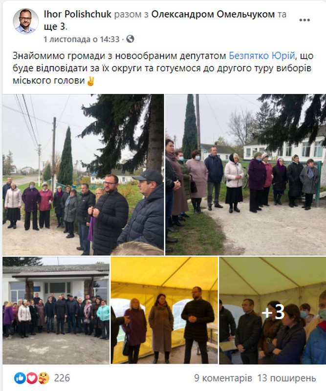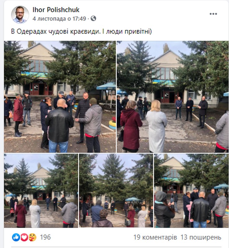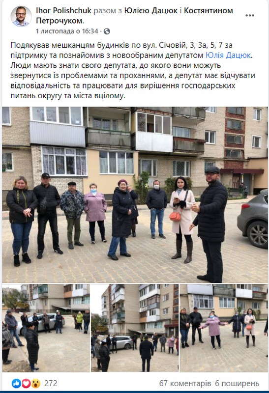 Того ж дня з’явився допис про участь його у зустрічі, на котрій громаду знайомили із новообраною депутаткою Юлією Дацюк. А 4 листопада на сторінці Ігоря Поліщука з’явився допис із фото відвідин ним села Одеради, котре також є частиною Луцької громади.