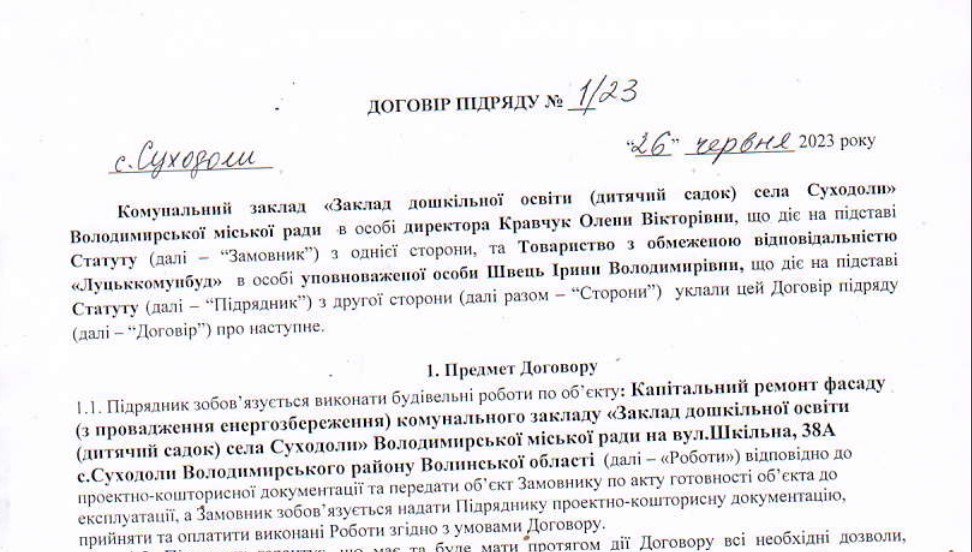 26 червня 2023 року комунальний заклад «Заклад дошкільної освіти села Суходоли» Володимирської міської ради уклав угоду з товариством з обмеженою відповідальністю «Луцьккомунбуд» на капітальний ремонт фасаду. Обумовлена вартість робіт, які передбачали утеплення будівлі, становила 1,7 мільйона гривень.