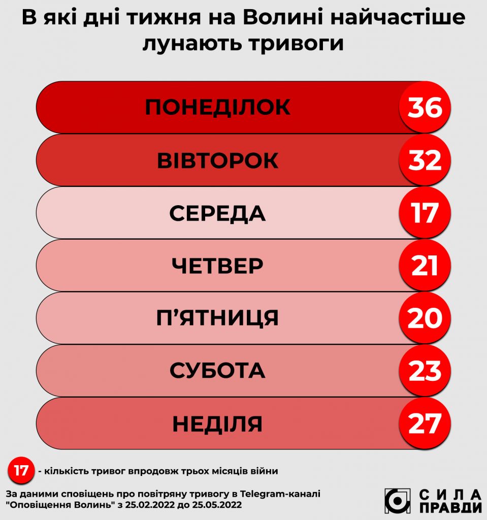 Також статистика показує, що найчастіше росіяни запускають ракети в сторону Волині по понеділках та вівторках. Тоді як по середах кількість таких випадків найнижча, але впродовж четверга-неділі поступово наростає.