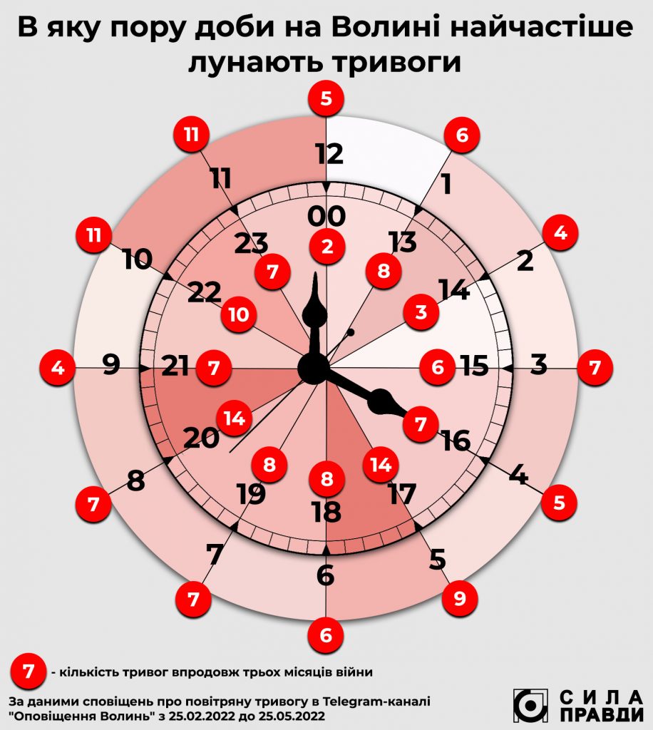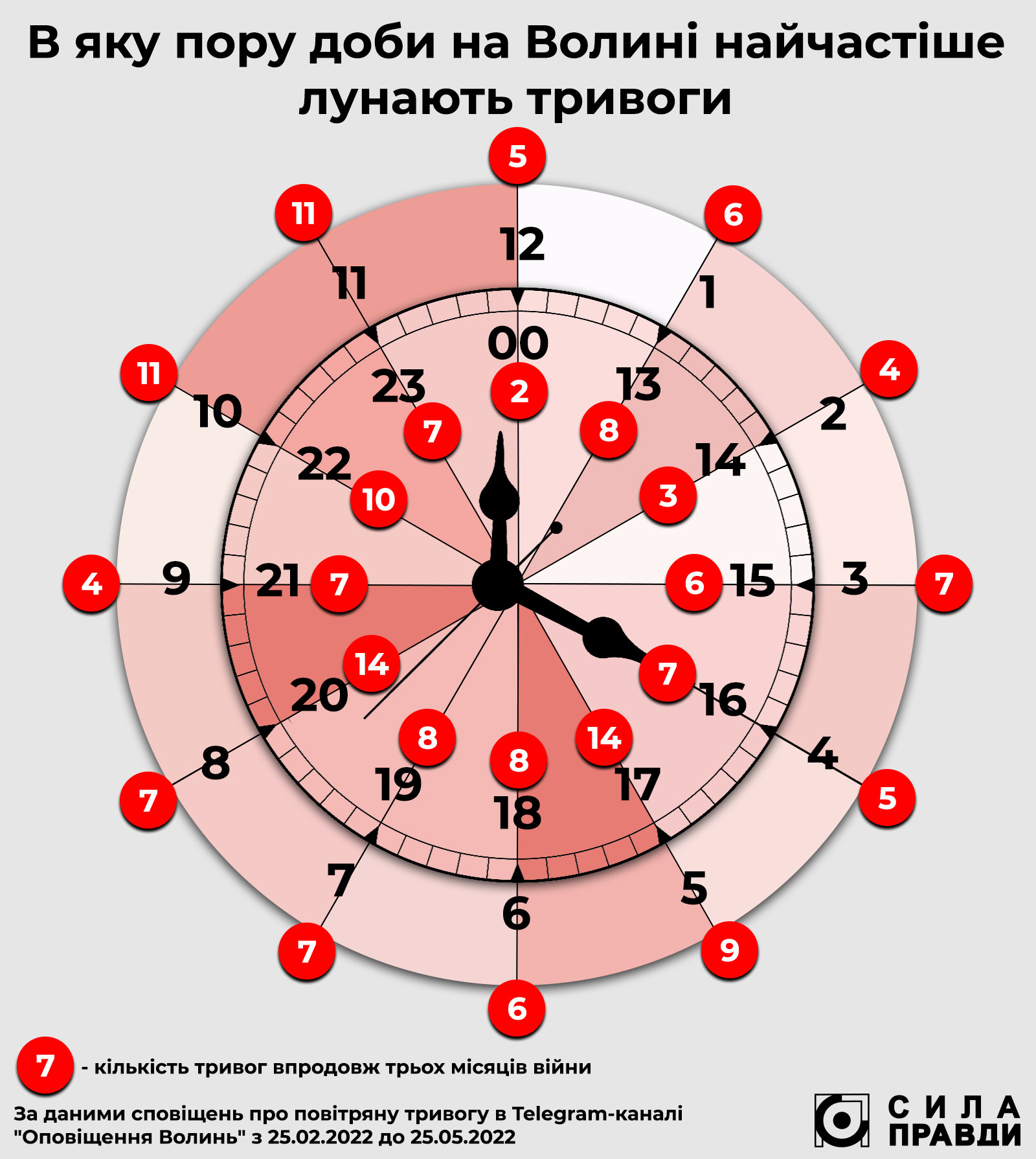 Третина тривожних повідомлень (56 із 176) пролунали в нічний час – між 22-ю годиною вечора та 7-ю ранку. З них 17 – до півночі, а 39 – після півночі.