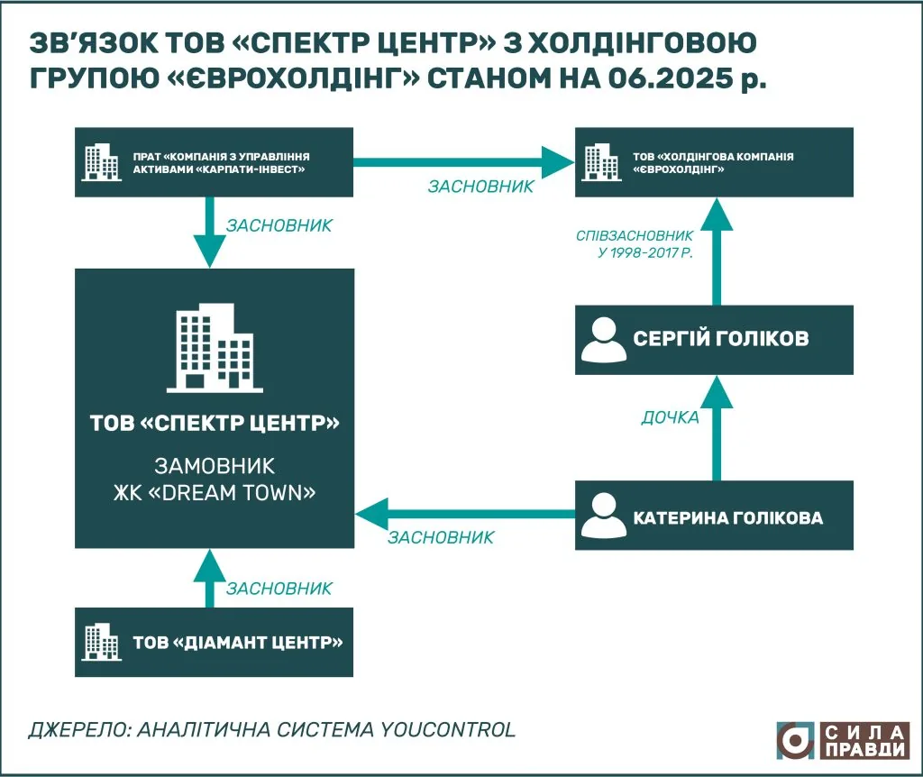 Замовник ЖК «Дрім Таун», компанія «Спектр центр», пов’язана з групою «Єврохолдінг», засновником якої свого часу був луцький бізнесмен Сергій Голіков.