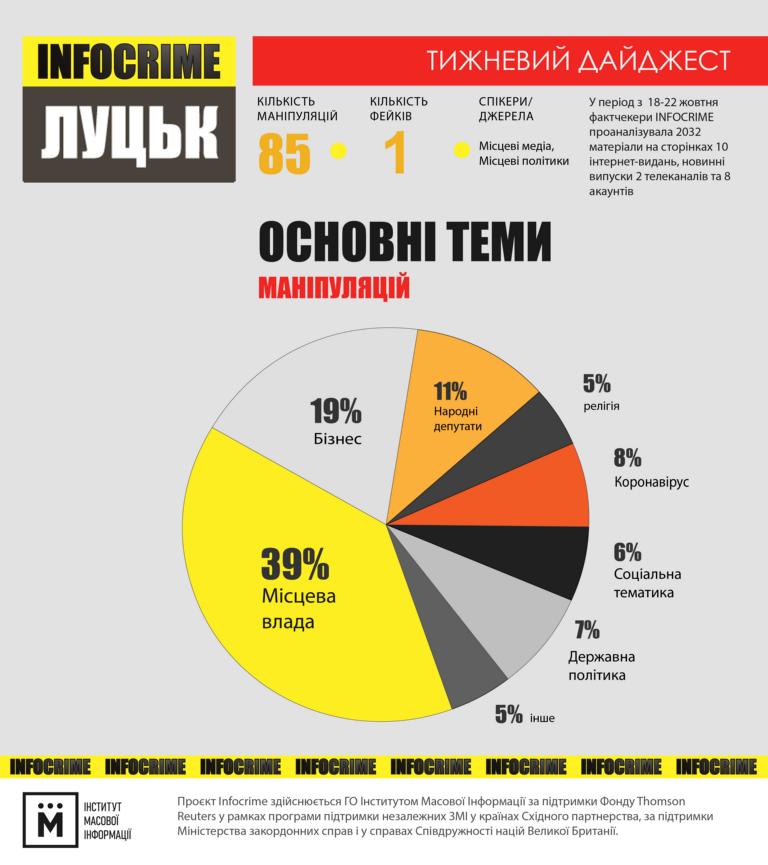 Такі дані отримала команда проєкту Infocrime Lutsk в результаті щотижневого моніторингу інформаційного простору за підтримки британського фонду Thompson Reuters, у партнерстві з Інститутом масової інформації.