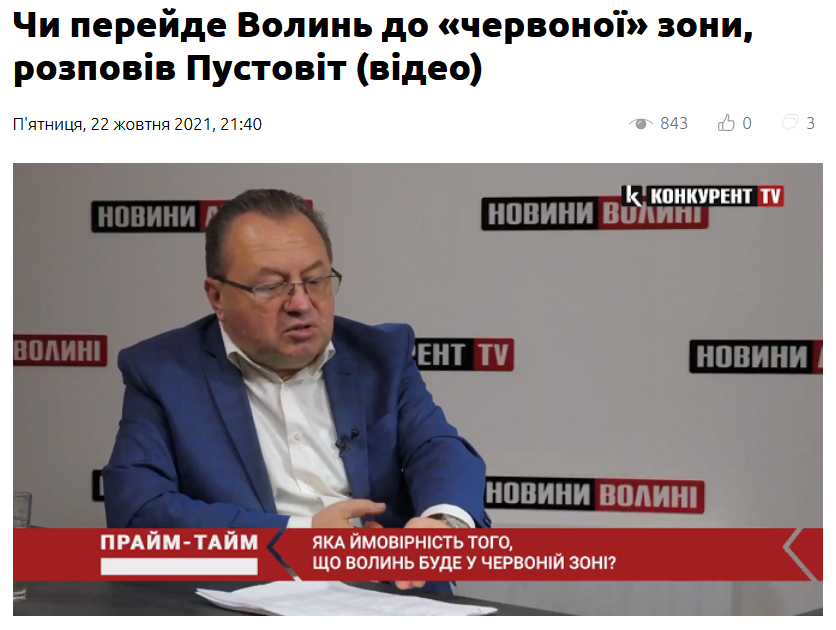 Видання «Конкурент» поширило новину на основі ефіру телеканалу «Конкурент ТВ» із заступником голови Волинської облради Григорієм Пустовітом. Заголовок новини: «Чи перейде Волинь до «червоної» зони, розповів Пустовіт (відео)». Заступник голови облради за посадою не є відповідальним за карантинні заходи в області. Також Пустовіт не є фахівцем у медицині і тому він не є компетентним спікером у питаннях щодо пандемії.