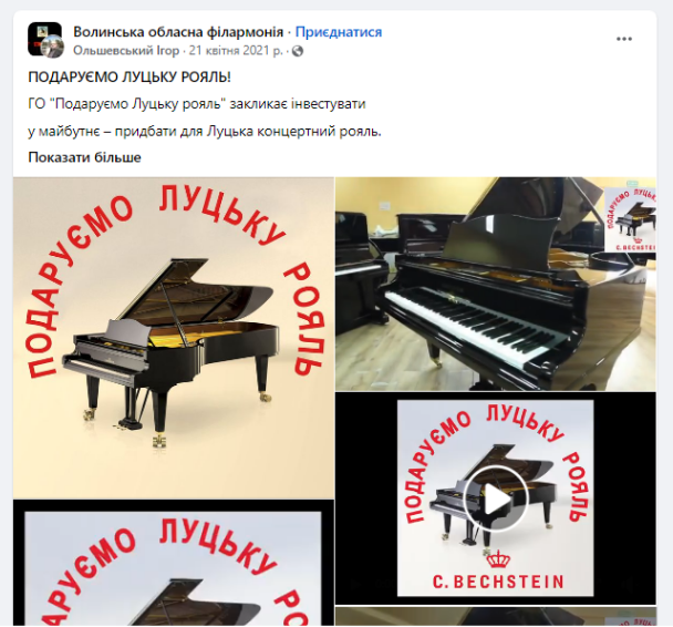 У 2015-му директор філармонії Сергій Єфіменко, директор «Палацу культури міста Луцька» Юрій Войнаровський та заслужений діяч мистецтв України Віктор Тиможинський створили громадську організацію «Подаруємо Луцьку рояль». Офіційно її метою було зібрати близько 5 мільйонів гривень на купівлю інструмента. З того часу благодійний збір коштів проводили чи не на кожному концерті та фестивалі філармонії. Від початку акції минуло 8 років, а роялю досі нема.
