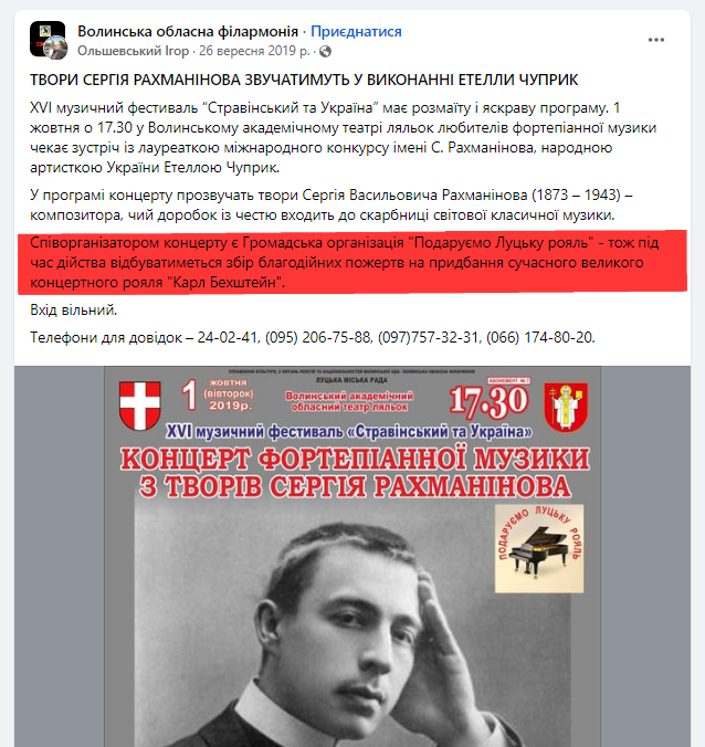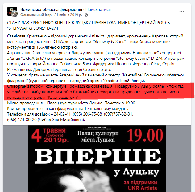 Навіщо Волинській обласній філармонії такий дорогий рояль, журналісти «Сили правди» поцікавилися у ще одного засновника організації Юрія Войнаровського.
