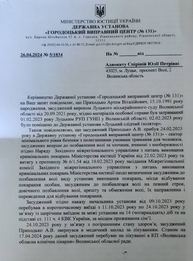Згідно з інформацією, яку Городоцький виправний центр надав адвокатці постраждалих Юлії Спіріній, станом на 17 квітня 2024 року Приходько перебував в стаціонарі цього закладу. Через два тижні на черговому судовому засіданні з розгляду клопотання про звільнення від кримінальної відповідальності, він нібито все ще лікувався в обласній лікарні. І навіть через місяць він все ще подавав до виправного центру довідки про стаціонарне лікування у ВОКЛ.