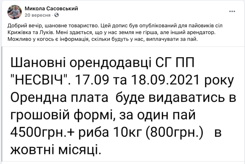 Новим орендарем виявилось підприємство «Захід-Сітка». Воно належить місцевим бізнесменам Юрію Чилію, за якого раніше клопотало ДП «Укрриба», і Володимиру Кучері. Останній водночас є власником сільськогосподарського приватного підприємства «Несвіч», де працює чимало мешканців громади. Крім того, «Несвіч» орендує сотні тисяч гектарів паїв на теренах Волині. А за землю з людьми частково розраховується… рибою.