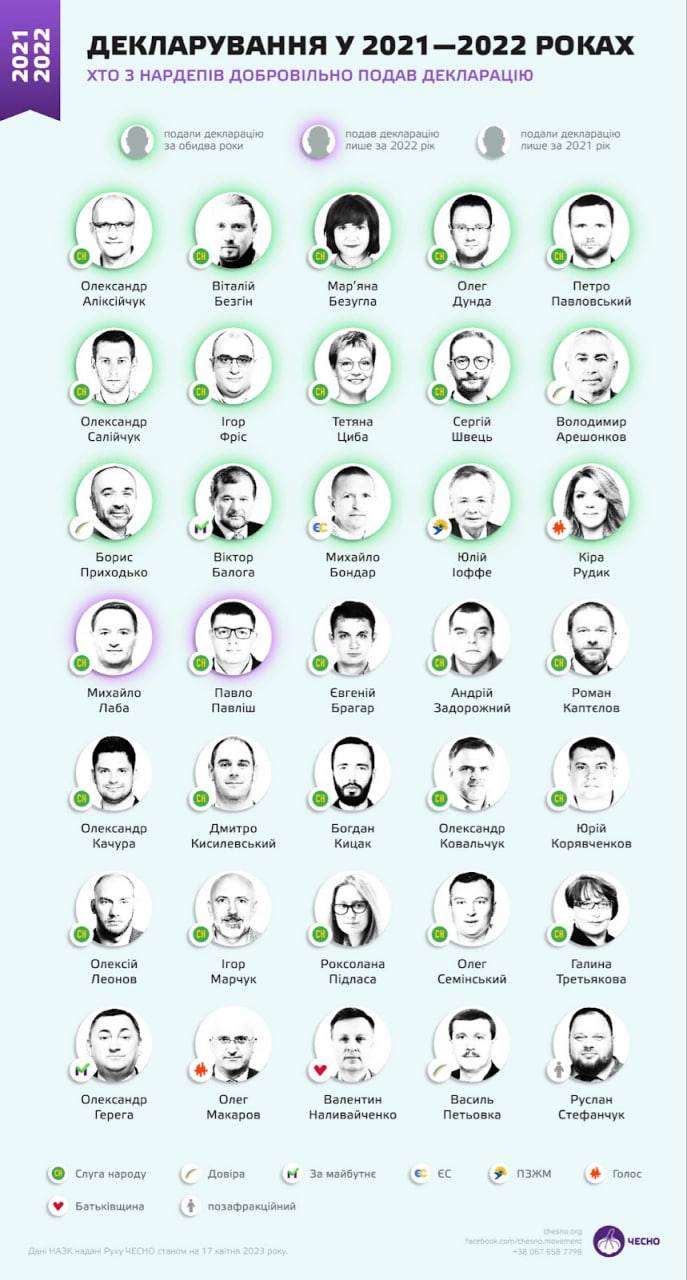 Серед тих хто добровільно подав декларації про майно і доходи за 2021-2022 роки немає нардепів з Волині Ігоря Гузя (виборчий округ №19, центр – м. Володимир), Степана Івахіва (виборчий округ №21, центр – м. Ковель), Ірини Констанкевич (виборчий округ №23, центр – смт. Маневичі), Ігоря Палиці (виборчий округ №22, центр – м. Луцьк), Вячеслава Рубльова (виборчий округ №20, центр – м. Горохів) та представника партії «Слуга народу» Валерія Стернійчука.