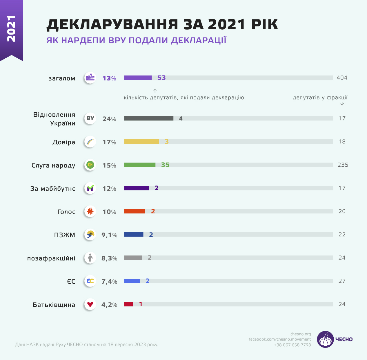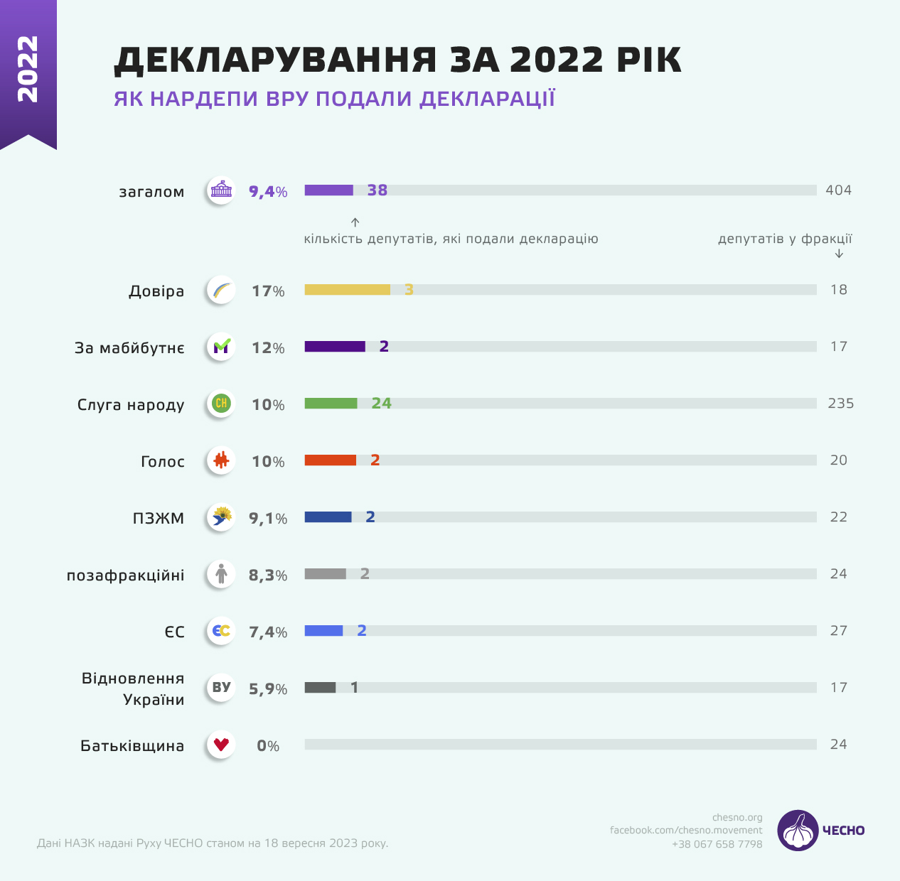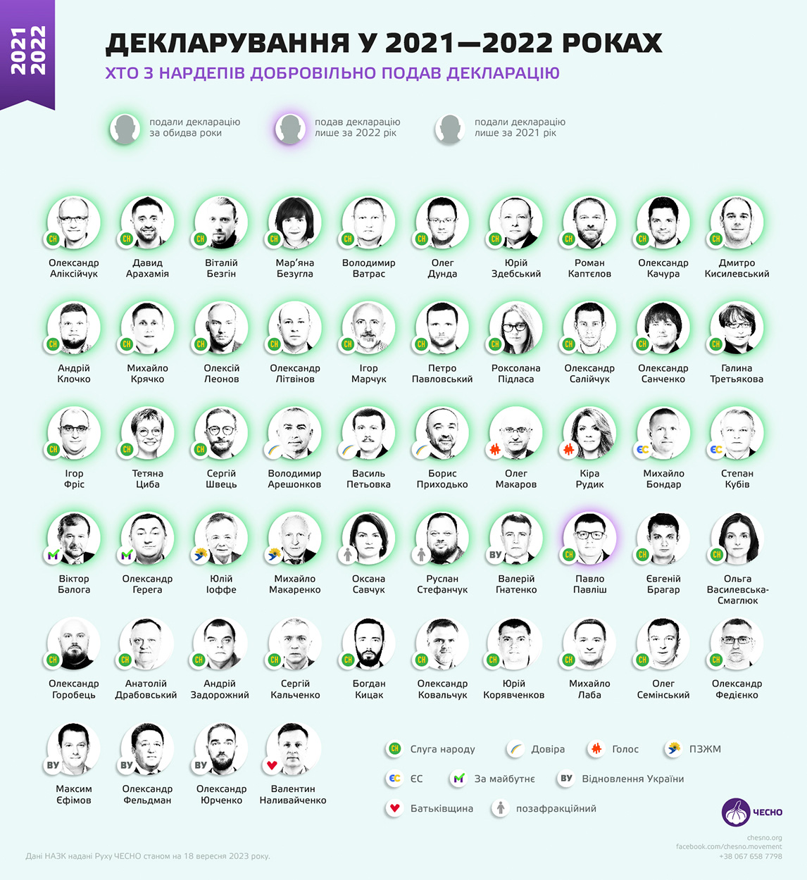 Загалом лише 53 народні депутати із 404 добровільно подали майнові декларації за 2021 рік. За 2022 рік їхня кількість іще менша — 38. Найбільша кількість добровільних декларацій надійшла до НАЗК від фракції влади — «Слуги народу», а за відсотком від загальної чисельності фракції чи групи — від представників «Відновлення України» та «Довіри». Серед керівництва парламенту декларації подав лише голова ВРУ Руслан Стефанчук — за обидва роки. Серед керівництва парламентських фракцій декларацію подав лише голова монобільшості Давид Арахамія, за обидва роки.